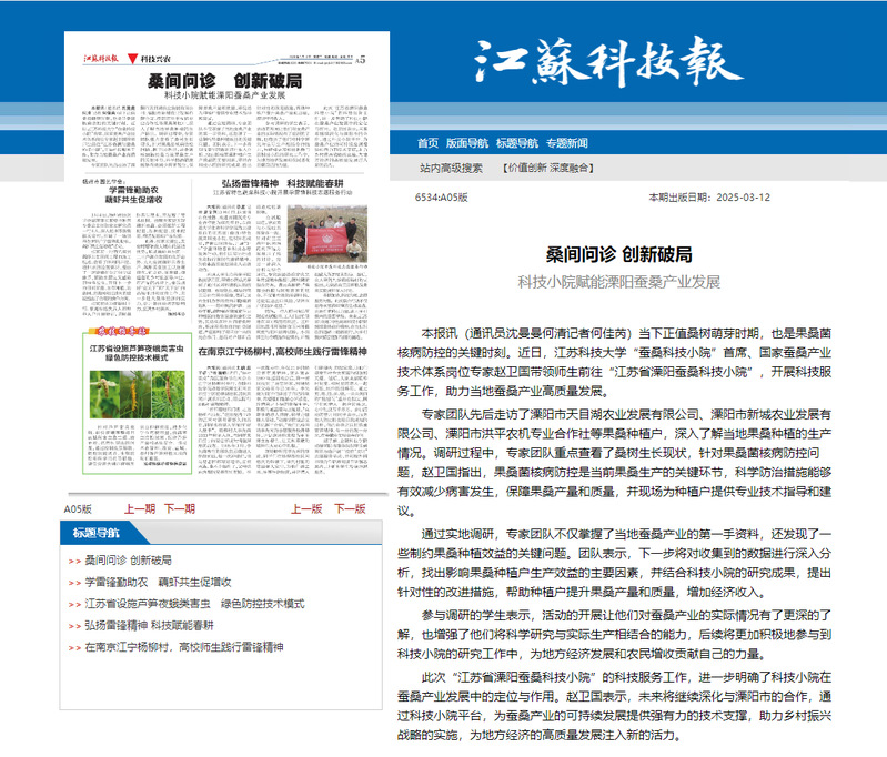 本報訊(通訊員沈曼曼何清記者何佳芮)當下正值桑樹萌芽時期,也是果桑菌核病防控的關鍵時刻。近日,江蘇科技大學“蠶桑科技小院”首席、國家蠶桑產業技術體系崗位專家趙衛國帶領師生前往“江蘇省溧陽蠶桑科技小院”,開展科技服務工作,助力當地蠶桑產業高質量發展。