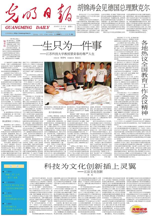 2010年7月17日《光明日報》報道景榮春教授事跡