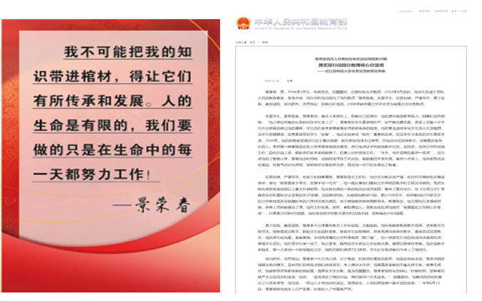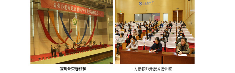 學校組建由景榮春同事宋向榮、學生王清曌和教師代表王遜組成的報告團,面向高校和社會從不同角度、不同側面生動地介紹景榮春同志愛崗敬業、關愛學生,刻苦鉆研、嚴謹篤學,勇于創新、奮發進取,淡泊名利、志存高遠的感人事跡。