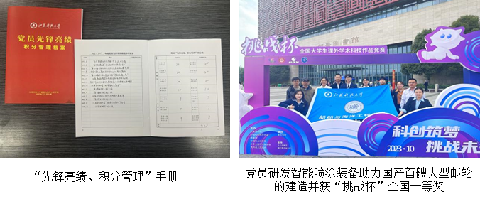 黨支部作為鎮江市黨員“先鋒亮績、積分管理”首批試點單位和先進單位,結合大學生人才培養目標制定基礎積分和貢獻積分,以積分激勵黨員。黨員設計研發智能噴涂裝備,為國產首艘大型郵輪的建造和維修提供技術保障,項目獲“挑戰杯”競賽全國二等獎。