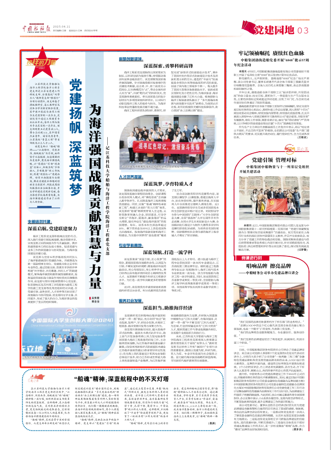 圍繞我國(guó)建設(shè)海洋強(qiáng)國(guó)的人才需求,該支部深度融合課程思政理念,創(chuàng)新課程分類(lèi)協(xié)同育人模式,將“課程思政”全面融入教學(xué)各環(huán)節(jié),扎實(shí)推進(jìn)海洋工程類(lèi)課程思政建設(shè)。同時(shí),實(shí)施“‘船魂’精神傳承創(chuàng)新工程”,構(gòu)建五步進(jìn)階“育人燈塔”體系。該支部將“船魂”精神貫穿育人全過(guò)程,從轉(zhuǎn)型教育到融入企業(yè),層層遞進(jìn),引導(dǎo)學(xué)生樹(shù)立“學(xué)海洋、愛(ài)海洋、獻(xiàn)身海洋”的遠(yuǎn)大理想,強(qiáng)化畢業(yè)生“建設(shè)海洋強(qiáng)國(guó)”的報(bào)國(guó)理想。每年,該系本科生深造率超過(guò)30%,剩下的畢業(yè)生80%以上奔赴祖國(guó)各大沿海地區(qū),投身海洋裝備創(chuàng)新和海洋工程建設(shè),為實(shí)踐中國(guó)夢(mèng)的“藍(lán)色篇章”輸送了生力軍。