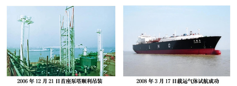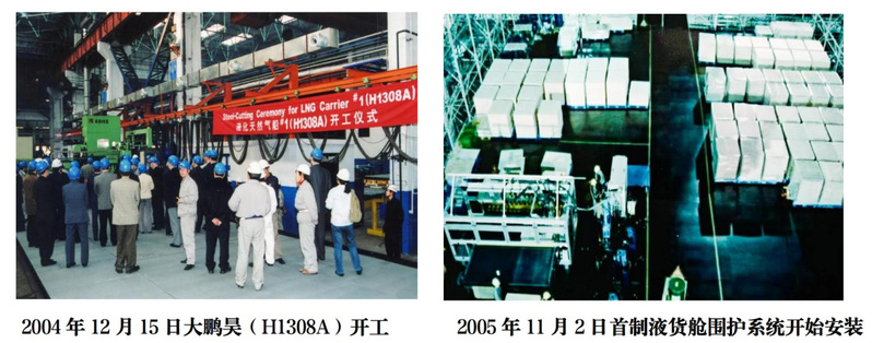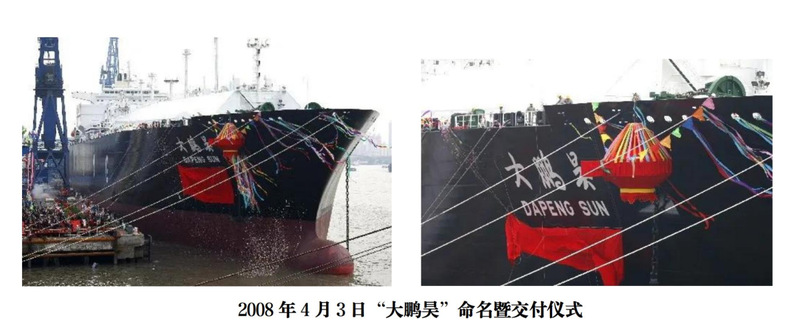 2008年4月3日,中國制造的第一艘液化天然氣(LNG)船“大鵬昊”命名交付,總長292米,寬43.35米,型深26.25米,航速19.5節(jié),裝載量達(dá)14.7萬立方米,是當(dāng)時世界上最大的薄膜型LNG船。其成功交付標(biāo)志著中國造船人首摘造船“皇冠上的明珠”,中國船舶工業(yè)實(shí)現(xiàn)LNG船“零”的突破,填補(bǔ)了中國LNG船生產(chǎn)設(shè)計、自主建造的空白,被國外船企壟斷的大型LNG運(yùn)輸船制造終于打破。2018年,為慶祝改革開放40周年,中國郵政發(fā)行的小型張《筑夢新時代》上,“大鵬昊”LNG船位于天安門右側(cè)“劈波斬浪”,寓意承載中華民族偉大復(fù)興夢想的中華巨輪乘著新時代的浩蕩東風(fēng),朝著“兩個一百年”奮斗目標(biāo)、中華民族偉大復(fù)興的中國夢揚(yáng)帆遠(yuǎn)航、奮勇向前。