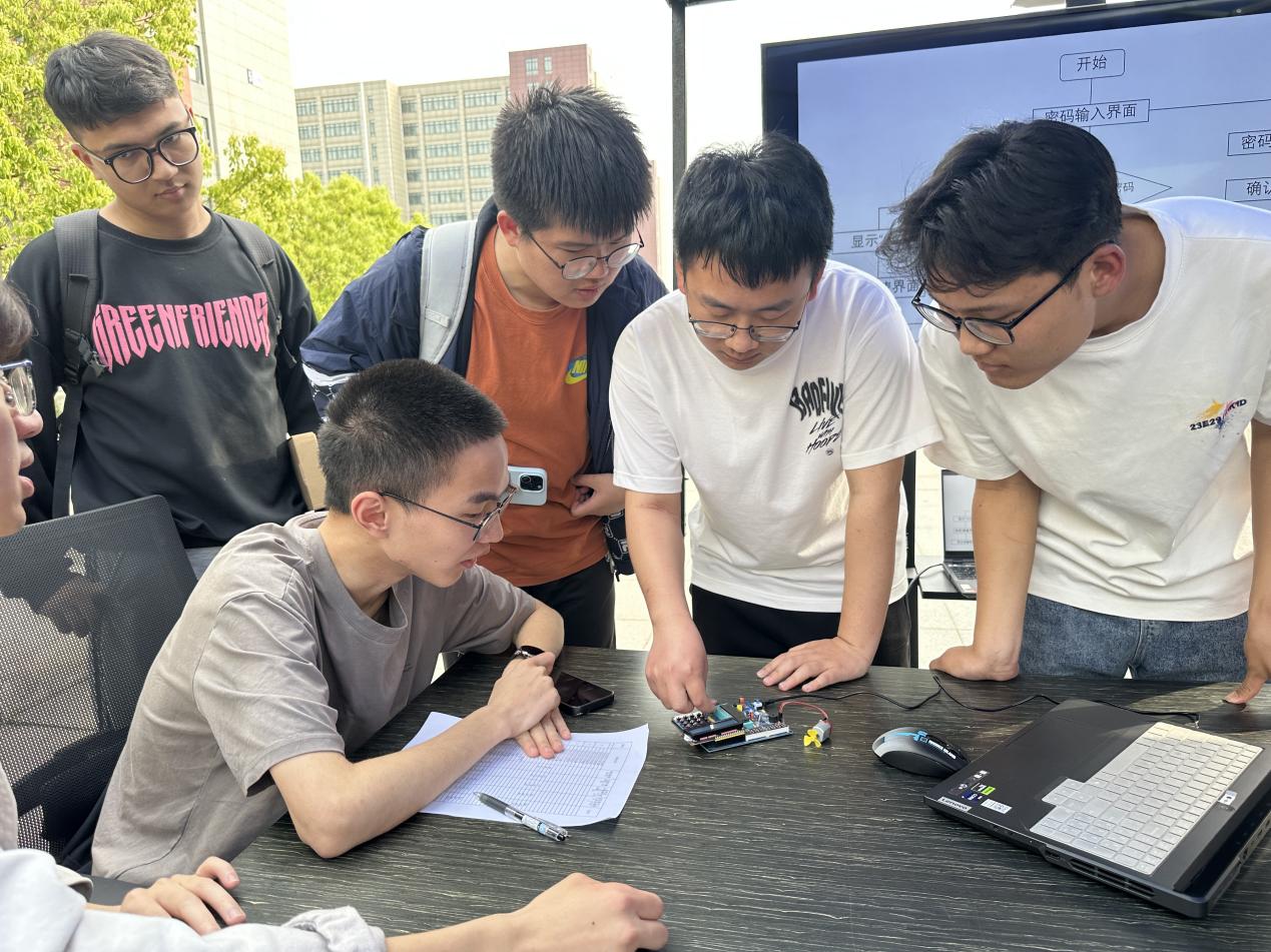 一站式社區(qū)門外同步開展“宿舍實驗箱”第一批驗收活動,各學生團隊圍繞驗收題目紛紛展示出自己的創(chuàng)新成果,通過PPT展示,詳細闡述設計思路、實施過程和創(chuàng)新點。例如210宿舍團隊選用了DS18B20 溫度傳感器,將其集成到系統(tǒng)中,實時監(jiān)測電機運行溫度,并通過 LCD1602 顯示屏將溫度信息清晰地展示給用戶。這一設計不僅提升了系統(tǒng)的安全性,也為電機的維護和保養(yǎng)提供了重要參考。