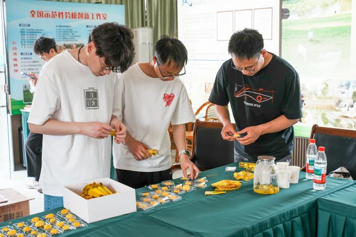 參觀結束后,支部黨員分組進行了農場實踐體驗。在“小組腌制咸鴨蛋”環節中,大家積極參與,親手制作咸鴨蛋,體會傳統工藝的魅力。“看似簡單的配方背后,也是沈老團隊上百次的試驗積累。”胡敏女士在介紹鹽與黃土的配比融合時說道。團隊協作包裝菊花茶時,成員們分工明確、默契配合,進一步強化了協作意識。“農業創新需要‘釘釘子精神’,黨員更要帶頭沉下心、俯下身。”勞動間隙沈曉昆先生與黨員們分享心得。通過親身體驗,研究生黨員不僅掌握了勞動技能,更在汗水中深刻領悟到了“愛崗敬業、精益求精”的勞動價值觀。