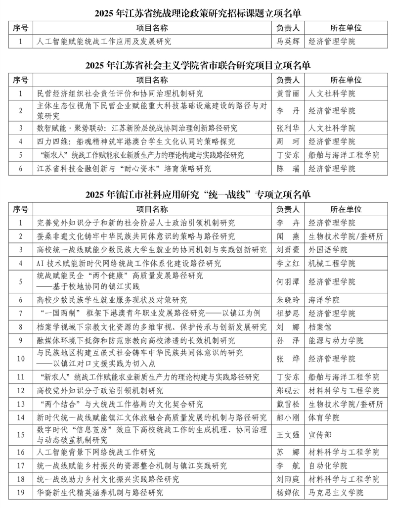 2025年度江蘇省委統(tǒng)戰(zhàn)部(單獨(dú)名義)招標(biāo)課題共立項(xiàng)13項(xiàng),我校獲批1項(xiàng)(每個課題類型立項(xiàng)數(shù)僅有1項(xiàng)),經(jīng)管學(xué)院馬英輝博士申報(bào)的《人工智能賦能統(tǒng)戰(zhàn)工作應(yīng)用及發(fā)展研究》從29個同類型申報(bào)項(xiàng)目中脫穎而出,成為唯一獲批項(xiàng)目;省社會主義學(xué)院省市聯(lián)合研究項(xiàng)目共立項(xiàng)25項(xiàng),我校獲批6項(xiàng)(全省高校第一);鎮(zhèn)江市社科應(yīng)用研究“統(tǒng)一戰(zhàn)線”專項(xiàng)課題共立項(xiàng)39項(xiàng),我校獲批19項(xiàng)(全市第一)。