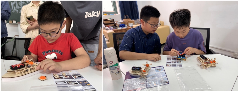 巧手造舟,匠心育人,親子協作實踐體驗。造船實踐環節中,貝殼學堂助教為每位小朋友準備了材料包,包含桐木片、電機、信號接收器等部件。在造船過程中,大學生講師團隊穿梭其間耐心解答每一個問題,在動手實踐中體驗到了無盡的樂趣,提高了青少年對船舶科學探索的濃厚興趣。